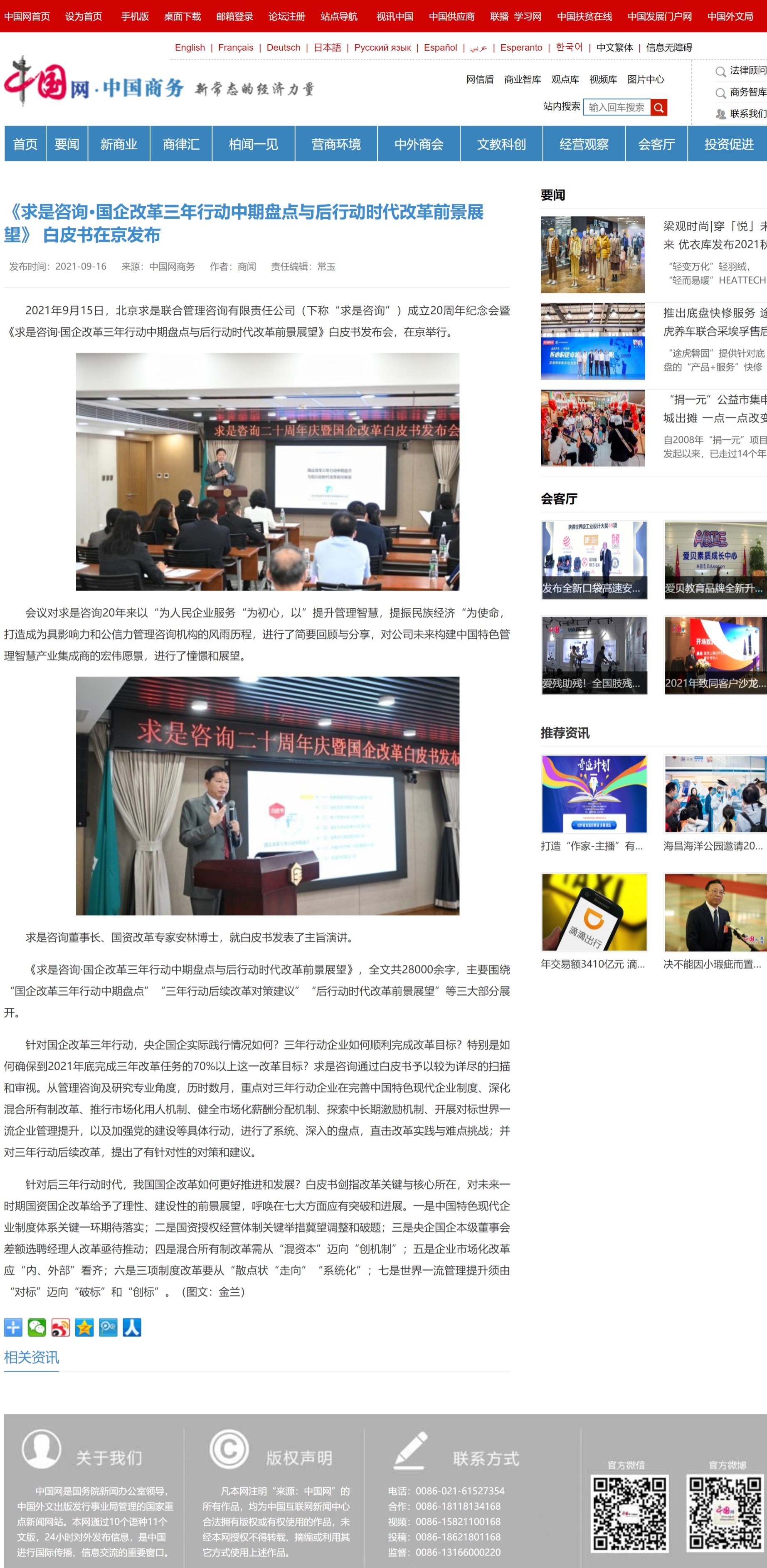 《中國網》:《求是咨詢·國企改革三年行動中期盤點與后行動時代改革前景展望》白皮書在京發(fā)布