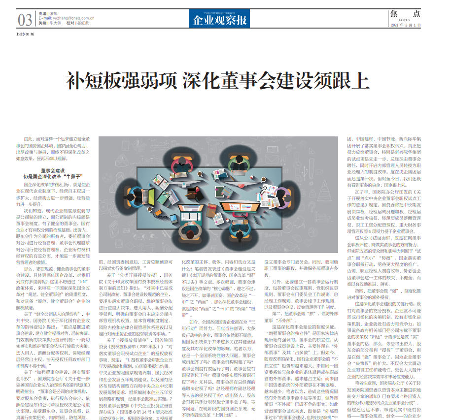 2021年2月1日,求是咨詢董事長安林博士最新撰文《補短板強弱項 深化董事會建設須跟上》刊發(fā)于《企業(yè)觀察報》頭版。
