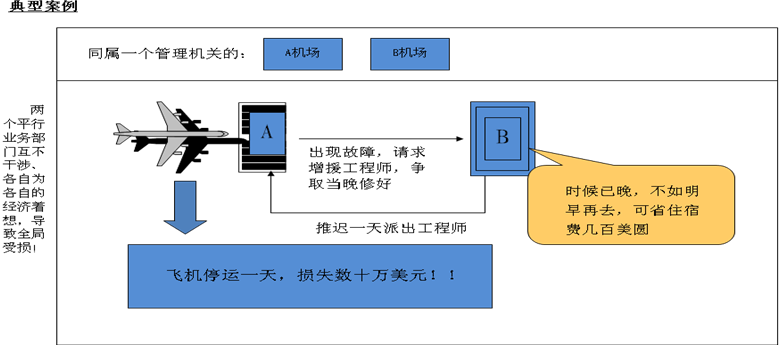 - 以部門或個(gè)人的角度來考慮工作分配或?qū)嵤,忽略整體資源的共用的概念,以致造成流程或工作重復(fù)的現(xiàn)象;