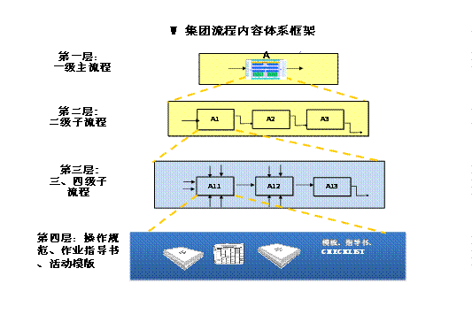 1、根據(jù)集團(tuán)和下屬二級(jí)單位之間的管控關(guān)系,流程共分為四級(jí):一級(jí)流程是指集團(tuán)與下屬二級(jí)單位兩層權(quán)力機(jī)構(gòu)之間的管控流程;二級(jí)流程是指集團(tuán)總部跨部門、跨機(jī)構(gòu)的流程和下屬二級(jí)單位跨部門、跨機(jī)構(gòu)的流程;三級(jí)流程是指部門內(nèi)、機(jī)構(gòu)內(nèi)的跨崗位工作流程;四級(jí)流程是指部門內(nèi)、機(jī)構(gòu)內(nèi)的獨(dú)立崗位工作流程。