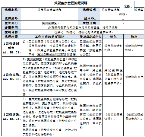 流程說明書以職責(zé)劃分為依據(jù),對(duì)業(yè)務(wù)運(yùn)行操作進(jìn)行指導(dǎo),是對(duì)流程的具體說明,是流程的重要組成部分。流程說明書要根據(jù)流程的變化進(jìn)行調(diào)整和完善,涵蓋流程名稱、流程說明、流程編號(hào)、流程版本號(hào)、流程主管部門、流程生效日期、流程適用范圍、流程控制目的、流程步驟等項(xiàng)目。明確活動(dòng)邏輯關(guān)系、配合制度指導(dǎo)業(yè)務(wù)活動(dòng)進(jìn)行;明確各角色在流程中的主要職責(zé)即工作內(nèi)容,提醒流程的關(guān)鍵節(jié)點(diǎn)即操作重心。